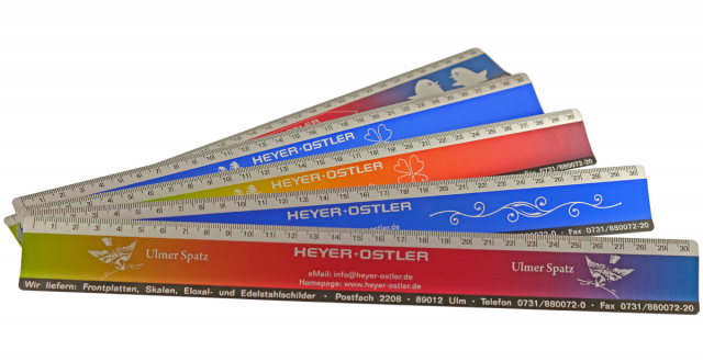 Wir fertigen für Sie Lineale mit Ihrem Firmen- oder Vereinslogo in Ihrer Wunschfarbe. Zusätzlich können diese individuell Laserbeschriftet werden.